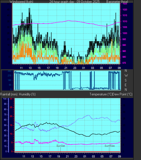 Maximum gust speed = 46.3 km/h from 293°(WNW) on day 09 at time 13:00