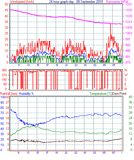 Maximum windspeed = 27.8 kmh from 248°(WSW) on day 04 at time 04:53