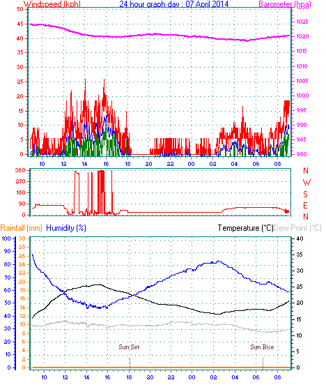 Maximum windspeed = 33.3 kmh from 00°( N ) on day 21 at time 14:52