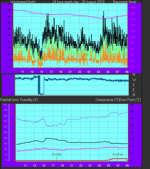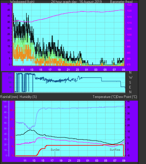 Maximum gust speed = 18.5 km/h from 240°(WSW) on day 01 at time 15:16